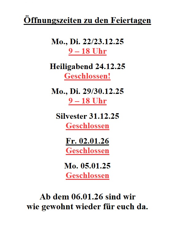 Am 31.12.2022 sind wir von 8 - 13 Uhr mit Voranmeldung für euch da.